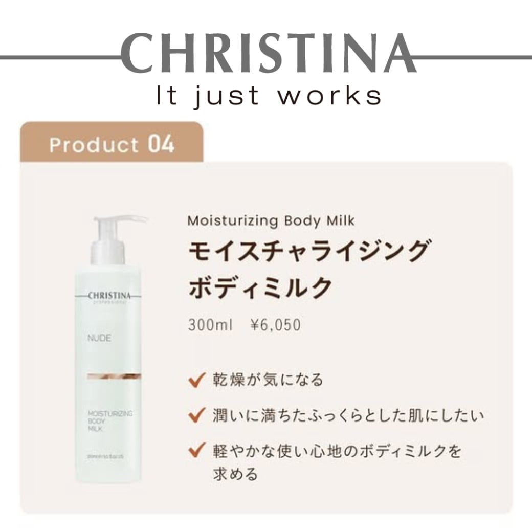 「NUDE」は、身体全体の美しさを育むことが真のスキンケアであるという考えに基づいています。顔だけでなく、全身を一つの肌として捉えることで、トータルに整えるというアプローチが新たな美しさを見出します。クリスティーナが長年にわたり培ってきたスキンケアのテクニックをボディにも適用し、究極のボディスキンケアを提供します。