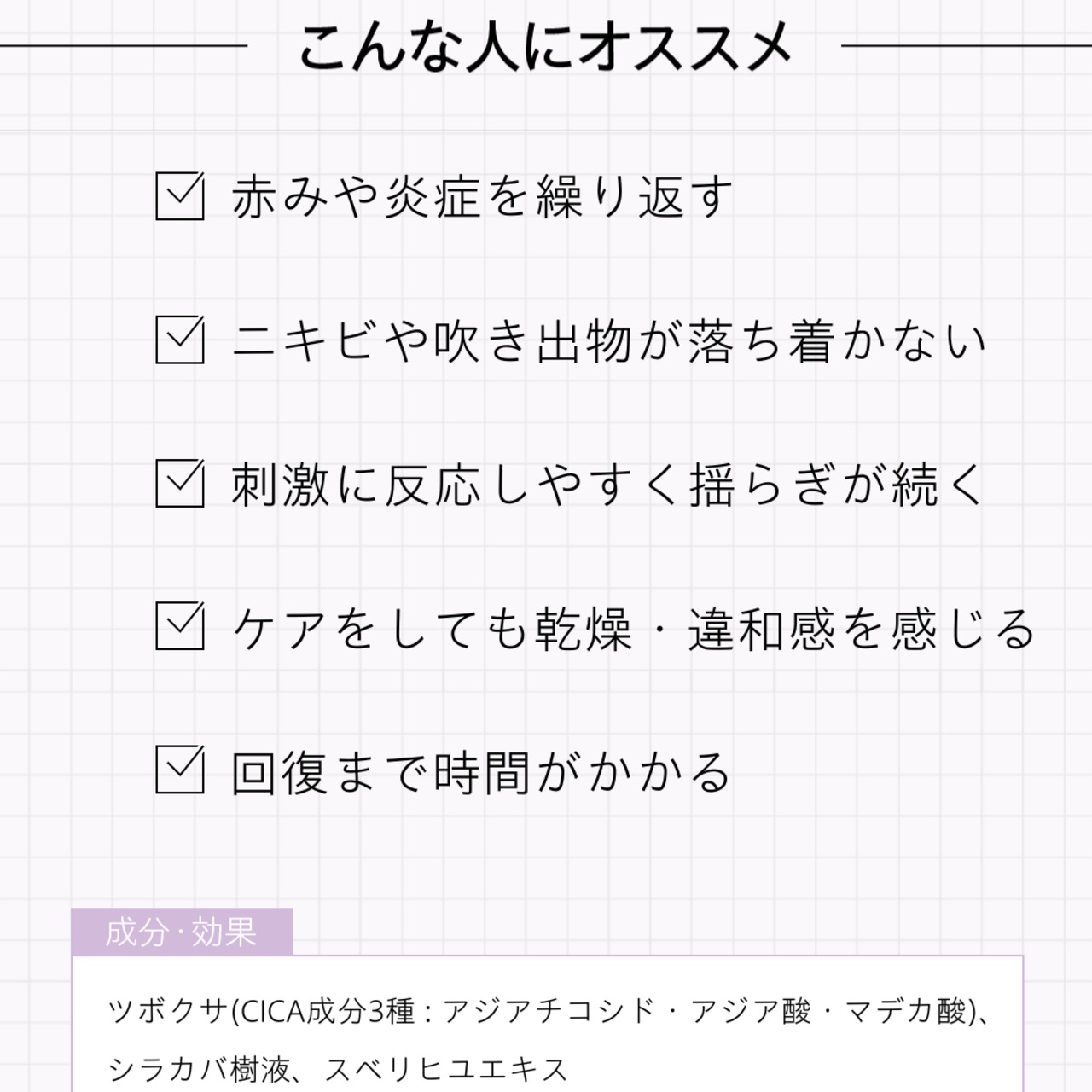 水, ブチレングリコール, オリーブ果実油, グリセリン, イソドデカン, 合成ワックス, スクワラン, シクロペンタシロキサン, カプリリルメチコン, オリーブ油脂肪酸セテアリル, シクロヘキサシロキサン, 1,2-ヘキサンジオール, ヒマワリ種子油, オリーブ油脂肪酸ソルビタン, ステアリン酸グリセリル, ステアリン酸PEG-100, パルミチン酸, アクリレーツコポリマーNa, ステアリン酸, アルキル(C30-45)セテアリルジメチコンクロスポリマー, レシチン, シラカバ樹液, エチルヘキシルグリセリン, オレンジ果皮油, スベリヒユエキス, アシアチコシド, アシアチン酸, マデカシン酸, レモン果皮油, EDTAジナトリウム, ベルガモット果実油, コプチスチネンシス根エキス, グリコール酸,ジメチルスルホン, サリチル酸, ラベンダー油, デキストリン,カカオエキス, ヒアルロン酸ナトリウム, ゼラニウム油, メボウキ油, トコフェロール, βグルカン, リモネン, リナロール