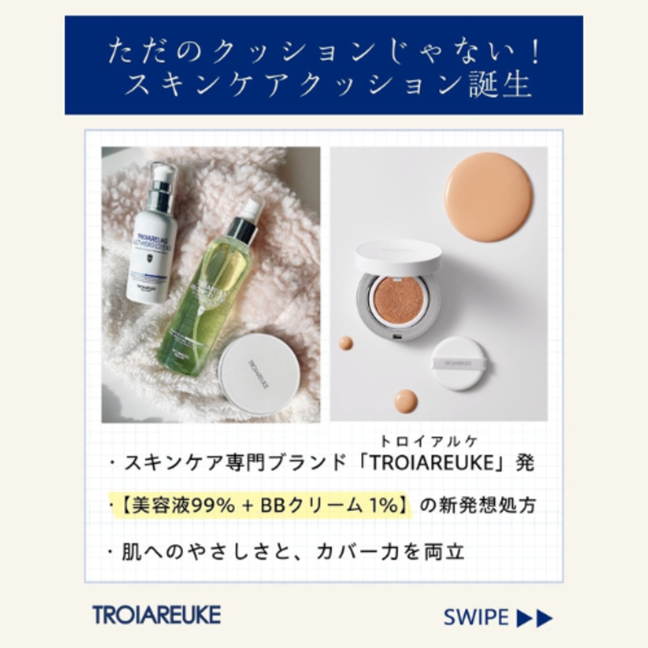 TROIAREUKEスキンケア・クッション・ファンデーションは、軽い付け心地で一日中つけていても疲れにくく、長時間カバー力が持続します。